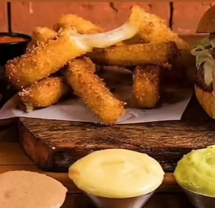 Palitos de mozarela artesanal, empanados em farinha japonesa temperada com Hub exclusivo, acompanhadas de molho de tomate da casa.